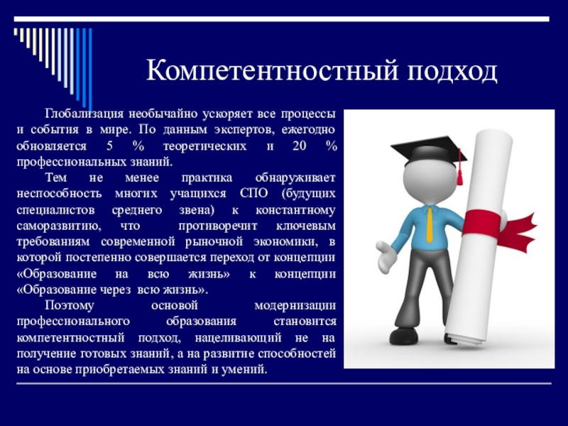 данным экспертов, ежегодно обновляется 5 % теоретических и 20 % профессиональных знаний.