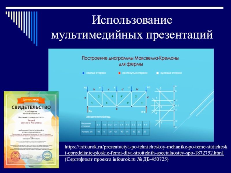 https://infourok.ru/prezentaciya-po-tehnicheskoy-mehanike-po-teme-staticheski-opredelimie-ploskie-fermi-dlya-stroitelnih-specialnostey-spo-1872752.html (Сертификат проекта infourok.ru № ДБ-450725)
