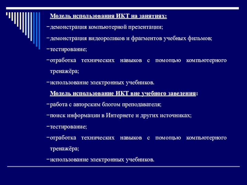 Слайд 18Модель использования ИКТ на занятиях: