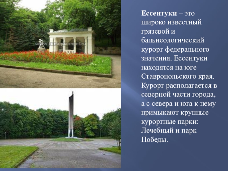 Слайд 6Ессентуки – это широко известный грязевой и бальнеологический курорт федерального значения. Ессентуки