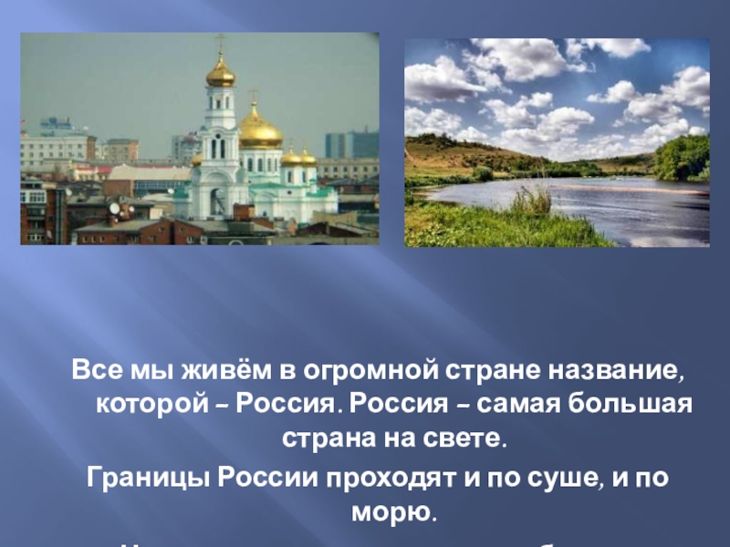 Все мы живём в огромной стране название, которой – Россия. Россия – самая большая страна на свете.Границы России проходят и по суше, и по морю.Наша страна очень красива и богата.