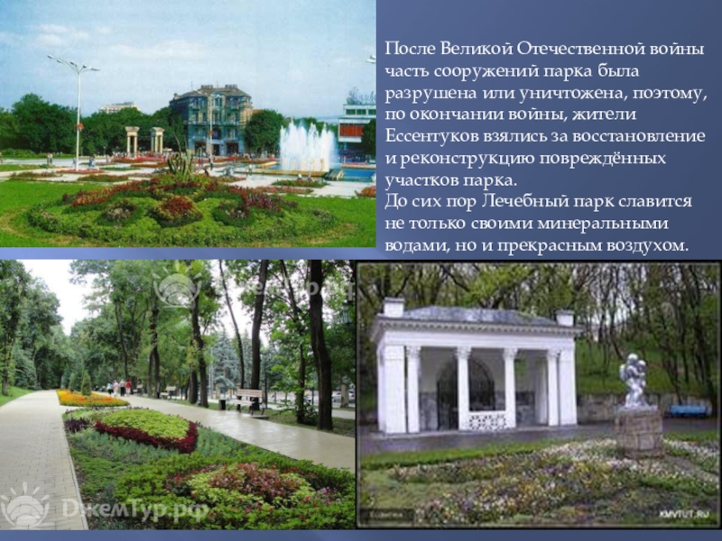 поэтому, по окончании войны, жители Ессентуков взялись за восстановление и реконструкцию повреждённых участков парка. До сих пор Лечебный парк славится не только своими минеральными водами, но и прекрасным воздухом.