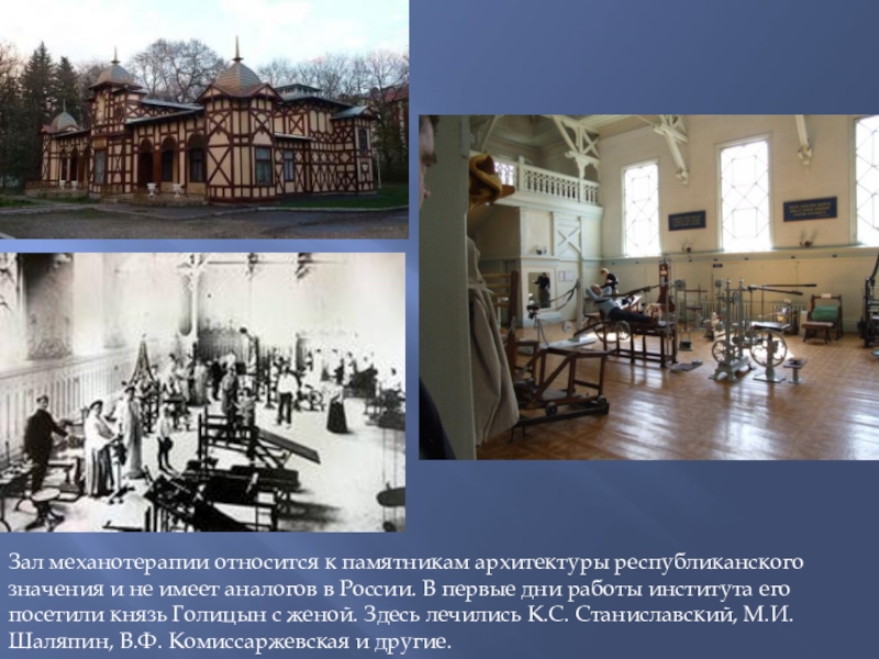 аналогов в России. В первые дни работы института его посетили князь Голицын с женой. Здесь лечились К.С. Станиславский, М.И. Шаляпин, В.Ф. Комиссаржевская и другие.