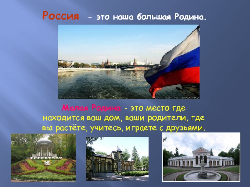 Россия - это наша большая Родина. Малая Родина - это место где находится ваш дом, ваши родители,
