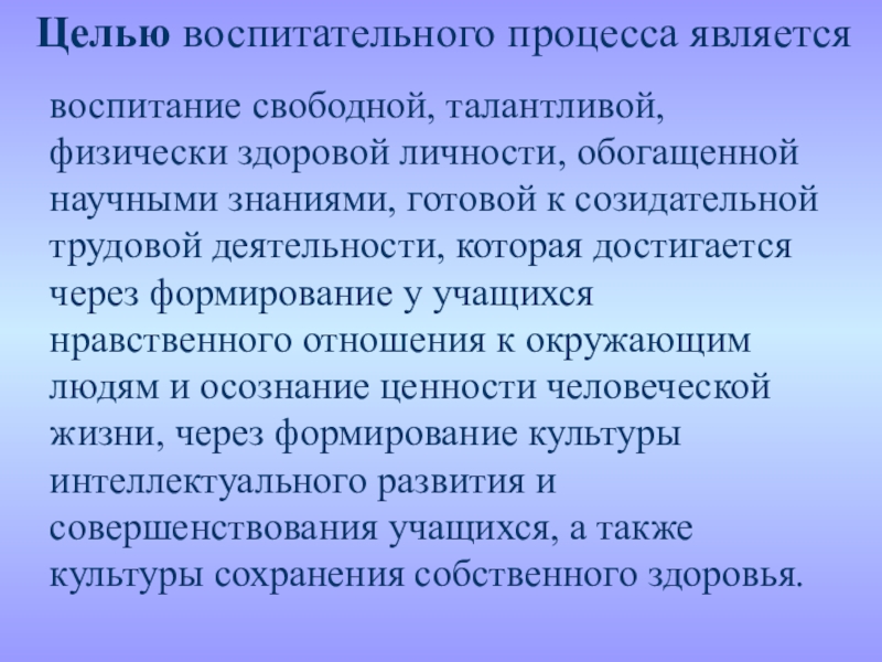 готовой к созидательной трудовой деятельности, которая достигается через формирование у учащихся нравственного отношения к окружающим людям и осознание ценности человеческой жизни, через формирование культуры интеллектуального развития и совершенствования учащихся, а также культуры сохранения собственного здоровья.