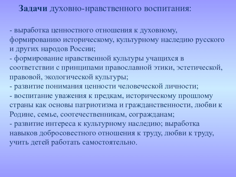 нравственное воспитание должно быть ориентировано на духовное развитие ребёнка;