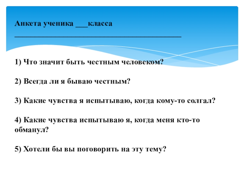 Анкета ученика ___класса _________________________________________   1) Что значит быть честным человеком?   2) Всегда ли я