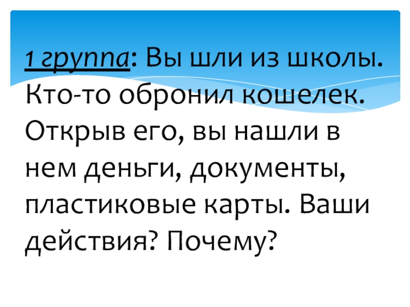 1 группа: Вы шли из школы. Кто-то обронил кошелек. Открыв его, вы нашли в нем деньги, документы,