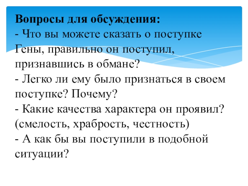 Вопросы для обсуждения:  - Что вы можете сказать о поступке Гены, правильно он поступил, признавшись в обмане?