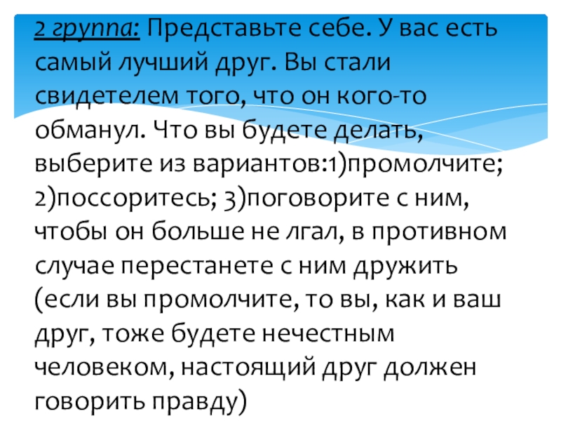 2 группа: Представьте себе. У вас есть самый лучший друг. Вы стали свидетелем того, что он кого-то обманул.