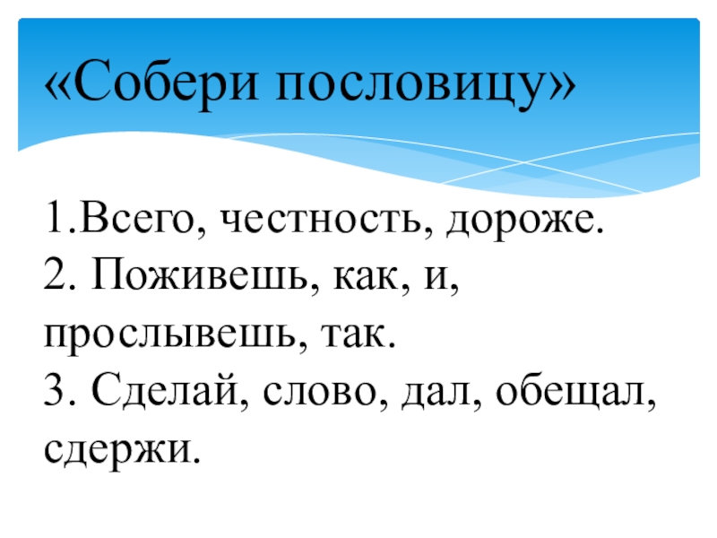 Слайд 10«Собери пословицу» 1.Всего, честность, дороже. 2. Поживешь, как, и, прослывешь, так. 3. Сделай,