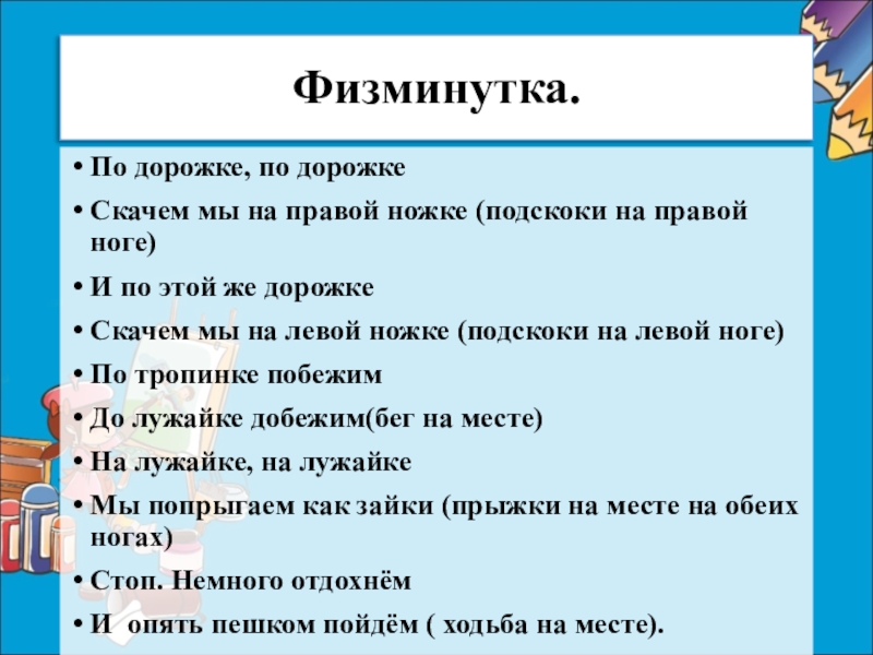 Физминутка.По дорожке, по дорожкеСкачем мы на правой ножке (подскоки на правой ноге)И по этой же дорожкеСкачем мы