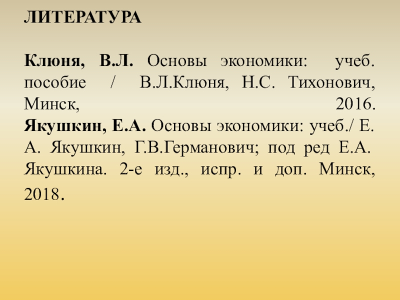 Клюня, В.Л. Основы экономики: учеб.пособие / В.Л.Клюня, Н.С. Тихонович, Минск, 2016.