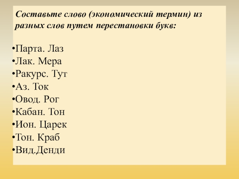Слайд 33Составьте слово (экономический термин) из разных слов путем перестановки букв: