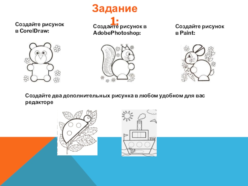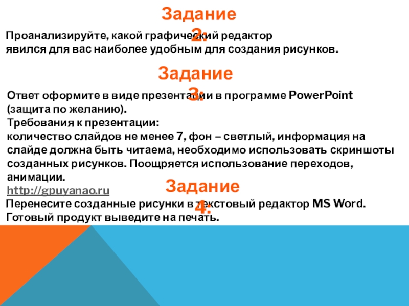 количество слайдов не менее 7, фон – светлый, информация на слайде должна быть читаема, необходимо использовать скриншоты созданных рисунков. Поощряется использование переходов, анимации.