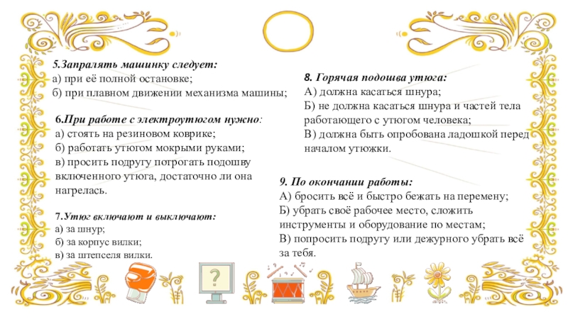 Б) не должна касаться шнура и частей тела работающего с утюгом человека;