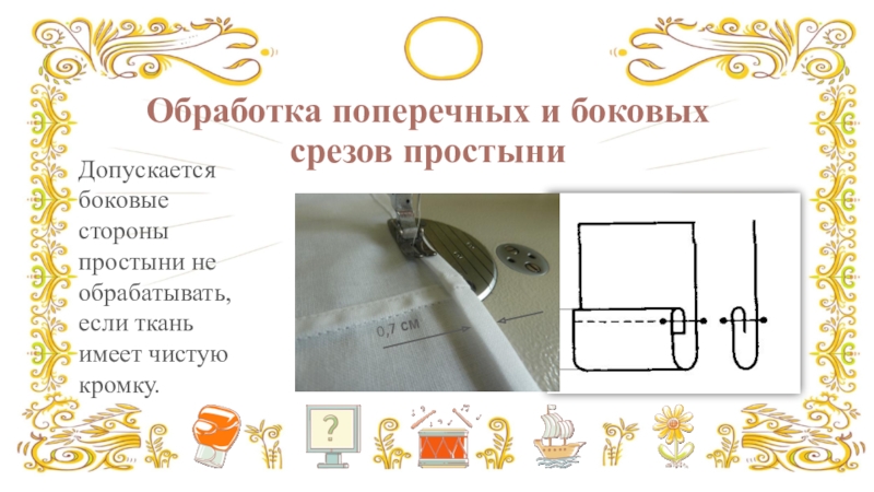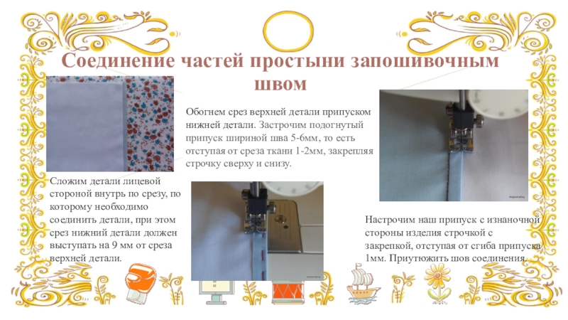 Обогнем срез верхней детали припуском нижней детали. Застрочим подогнутый припуск шириной шва 5-6мм, то есть отступая от среза ткани 1-2мм, закрепляя строчку сверху и снизу.