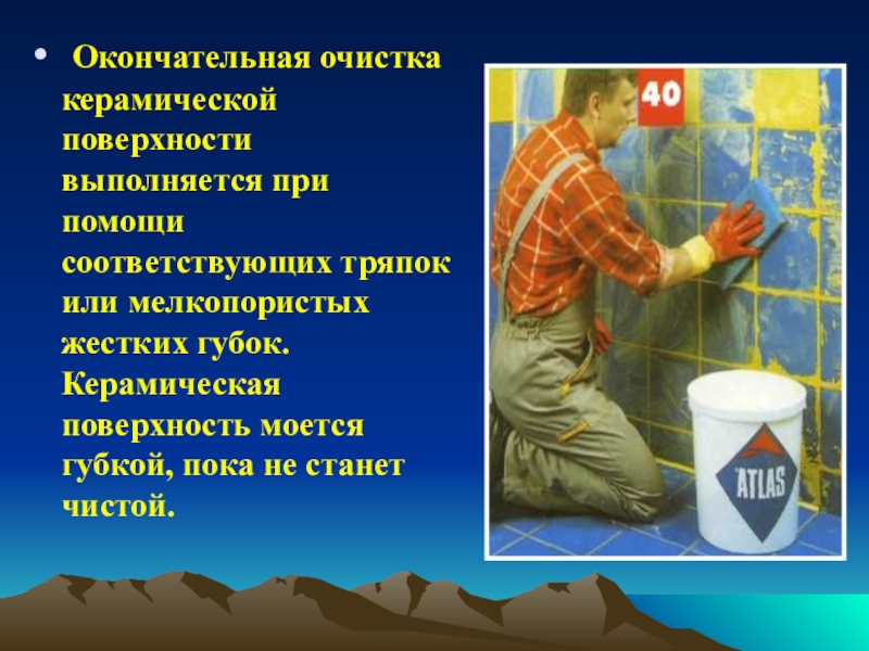 Слайд 25 Окончательная очистка керамической поверхности выполняется при помощи соответствующих тряпок или