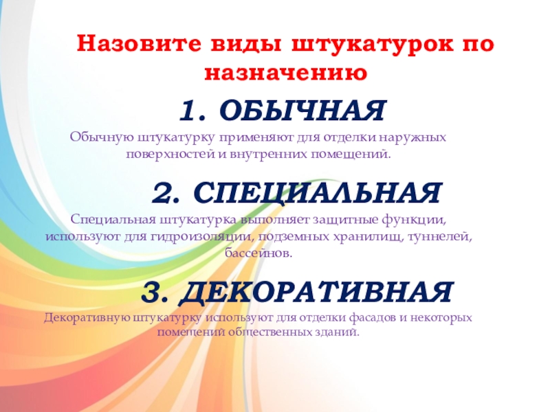 Назовите виды штукатурок по назначению       1. ОБЫЧНАЯОбычную штукатурку применяют для отделки