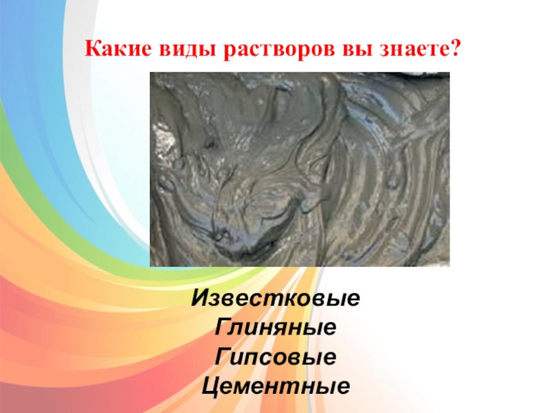 Какие виды растворов вы знаете?Известковые Глиняные Гипсовые Цементные