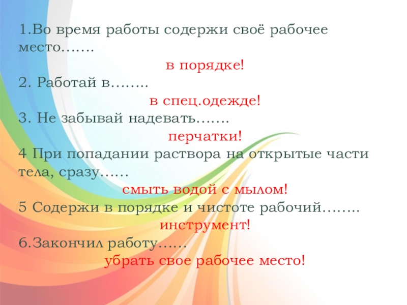 1.Во время работы содержи своё рабочее место…….в порядке!2. Работай в……..в спец.одежде!3. Не забывай надевать…….перчатки!4 При попадании раствора