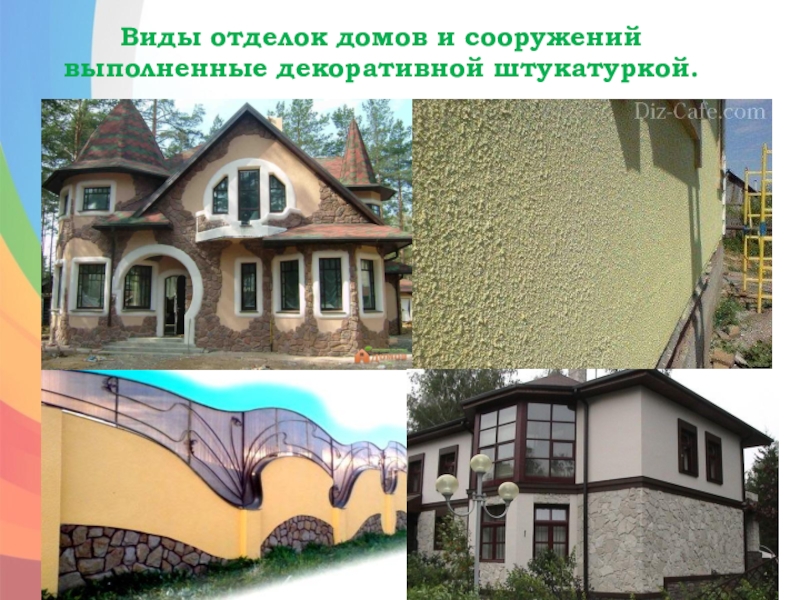 Слайд 12Виды отделок домов и сооружений выполненные декоративной штукатуркой.