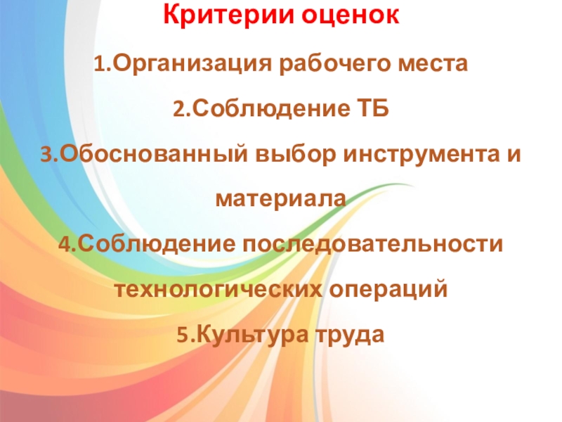 Слайд 2Критерии оценок 1.Организация рабочего места 2.Соблюдение ТБ 3.Обоснованный выбор инструмента и материала 4.Соблюдение последовательности технологических