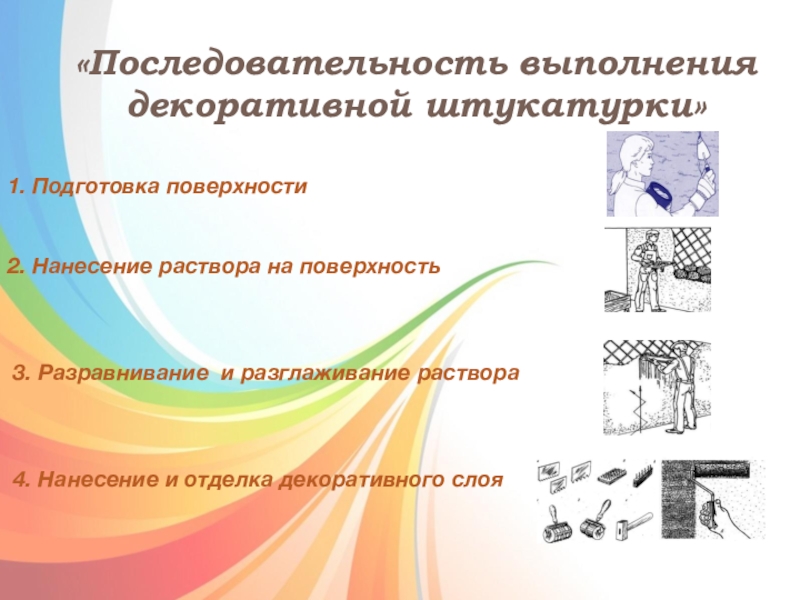 «Последовательность выполнения декоративной штукатурки»   1. Подготовка поверхности       2. Нанесение