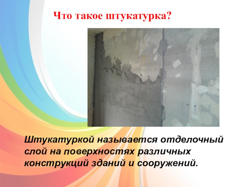 Что такое штукатурка?Штукатуркой называется отделочный слой на поверхностях различных конструкций зданий и сооружений.