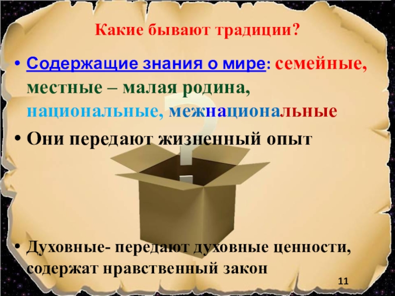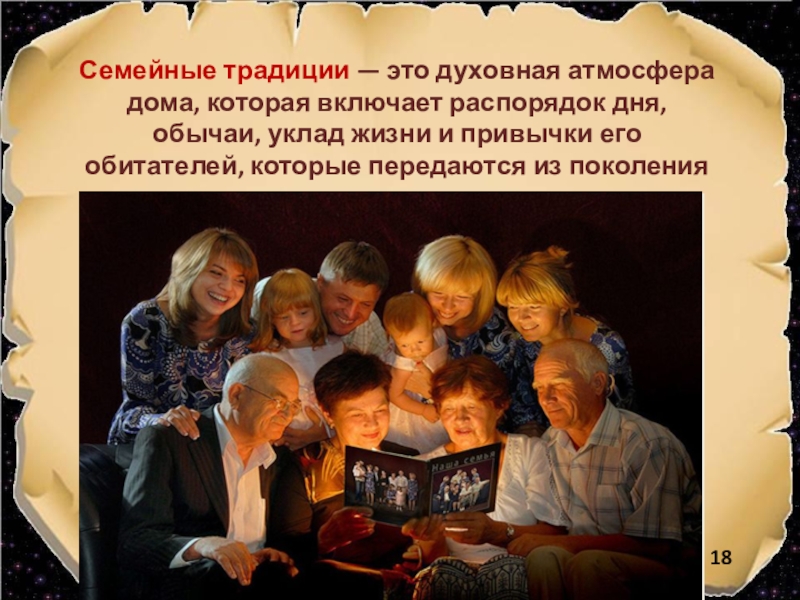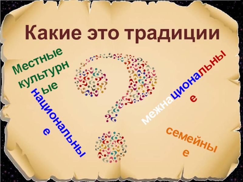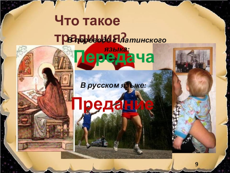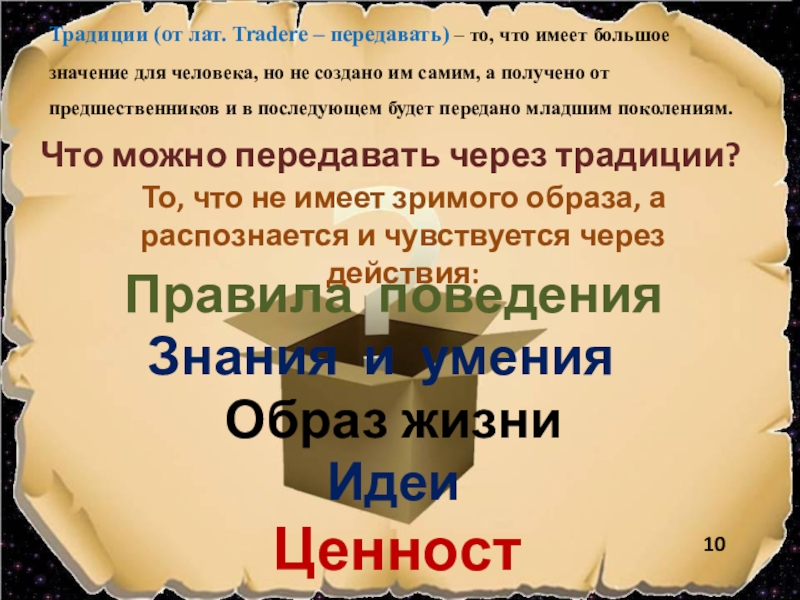 Традиции (от лат. Tradere – передавать) – то, что имеет большое значение для человека, но не создано им самим, а получено от предшественников и в последующем будет передано младшим поколениям.