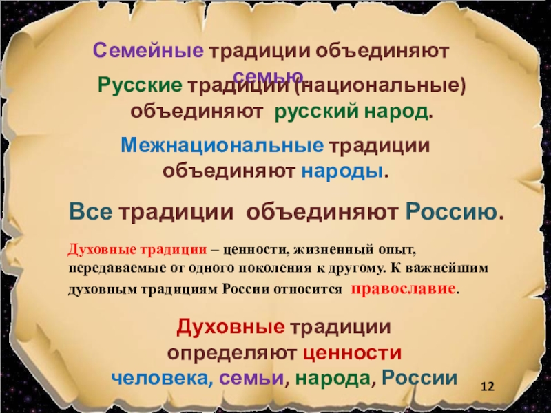 Духовные традиции – ценности, жизненный опыт, передаваемые от одного поколения к другому. К важнейшим духовным традициям России относится православие.