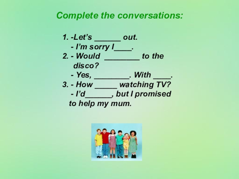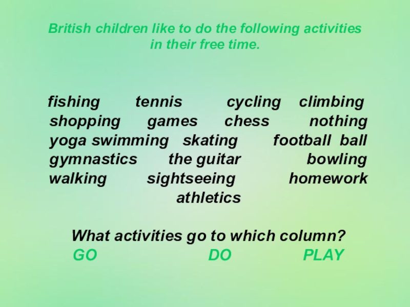 shopping games chess nothing yoga swimming skating football ball gymnastics the guitar bowling walking sightseeing homework athletics