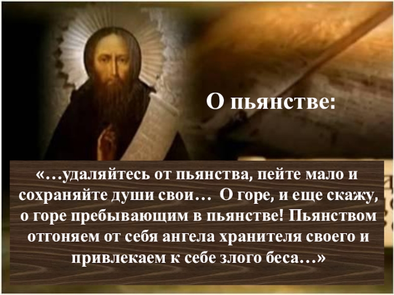 горе, и еще скажу, о горе пребывающим в пьянстве! Пьянством отгоняем от себя ангела хранителя своего и привлекаем к себе злого беса…»