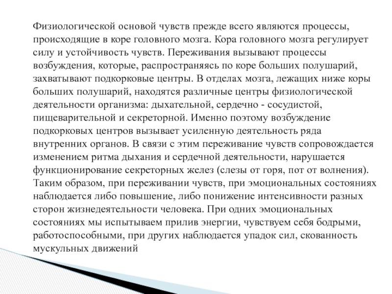 мозга. Кора головного мозга регулирует силу и устойчивость чувств. Переживания вызывают процессы возбуждения, которые, распространяясь по коре больших полушарий, захватывают подкорковые центры. В отделах мозга, лежащих ниже коры больших полушарий, находятся различные центры физиологической деятельности организма: дыхательной, сердечно - сосудистой, пищеварительной и секреторной. Именно поэтому возбуждение подкорковых центров вызывает усиленную деятельность ряда внутренних органов. В связи с этим переживание чувств сопровождается изменением ритма дыхания и сердечной деятельности, нарушается функционирование секреторных желез (слезы от горя, пот от волнения). Таким образом, при переживании чувств, при эмоциональных состояниях наблюдается либо повышение, либо понижение интенсивности разных сторон жизнедеятельности человека. При одних эмоциональных состояниях мы испытываем прилив энергии, чувствуем себя бодрыми, работоспособными, при других наблюдается упадок сил, скованность мускульных движений