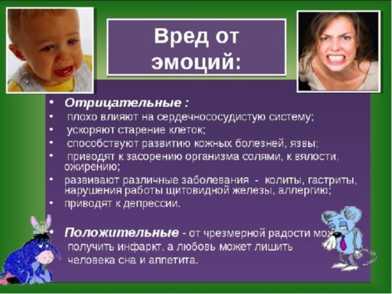 Астенические эмоции уменьшают активность, энергию человека, сокращают жизнедеятельность (печаль, тоска, уныние, подавленность). Астенические эмоции характеризуются пассивностью, созерцательностью, расслабляют человека