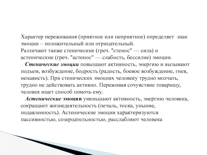 Различают также стенические (греч. "стенос" — сила) и астенические (греч. "астенос" — слабость, бессилие) эмоции.