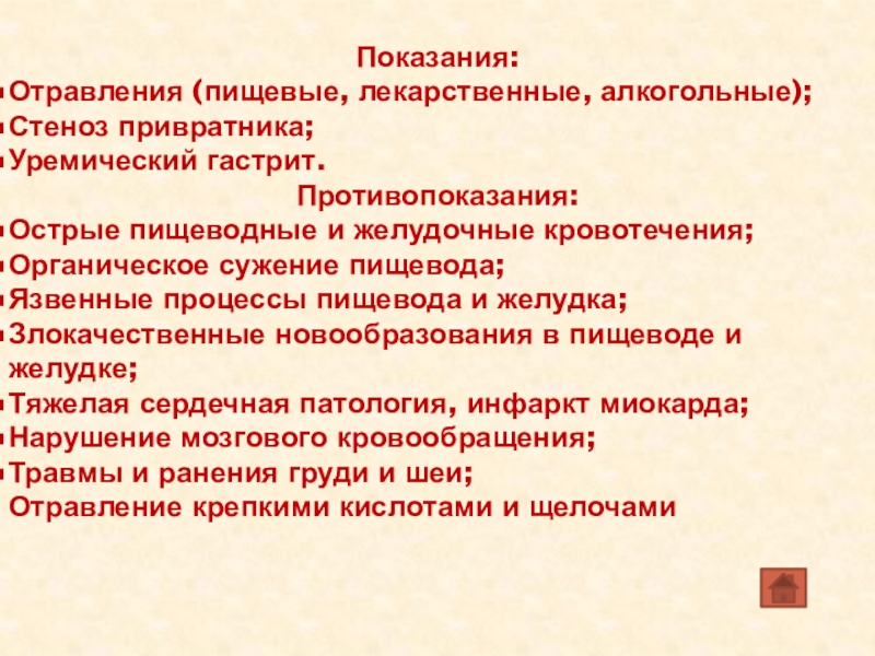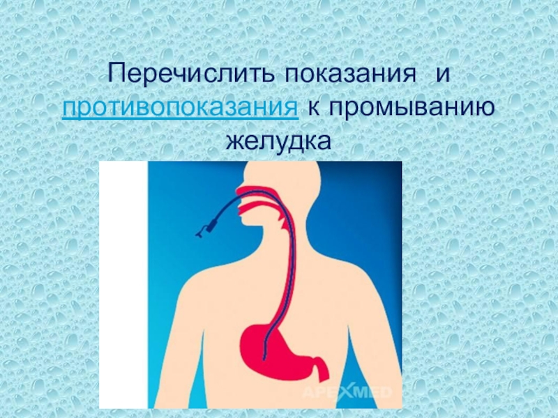 Слайд 34Перечислить показания и противопоказания к промыванию желудка
