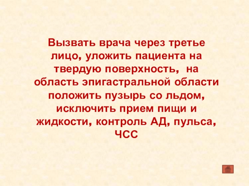 область эпигастральной области положить пузырь со льдом, исключить прием пищи и жидкости, контроль АД, пульса, ЧСС