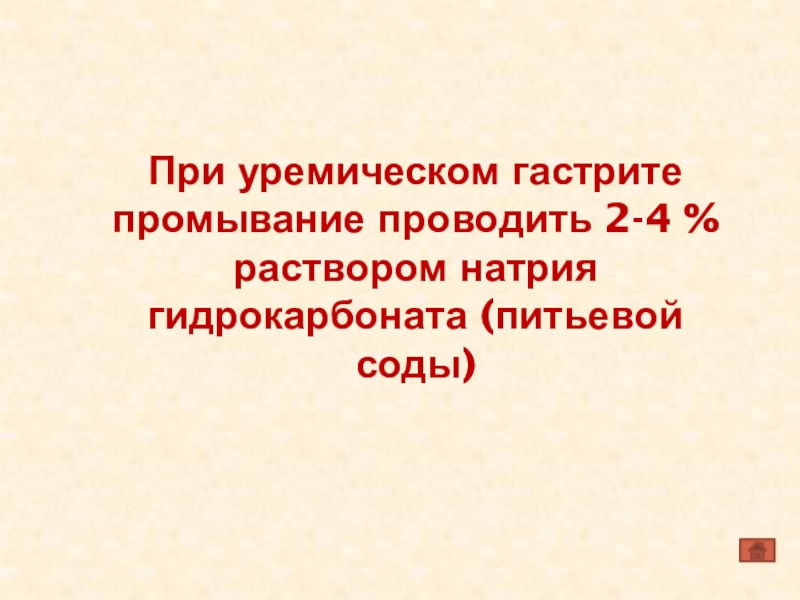 Слайд 61При уремическом гастрите промывание проводить 2-4 % раствором натрия гидрокарбоната (питьевой