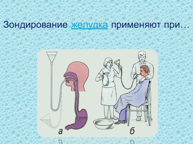 Слайд 53Зондирование желудка применяют при промывании желудка, исследовании желудочного сока, искусственном питании
