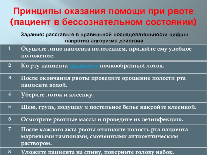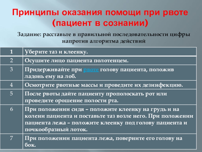 Слайд 46Принципы оказания помощи при рвоте (пациент в сознании)