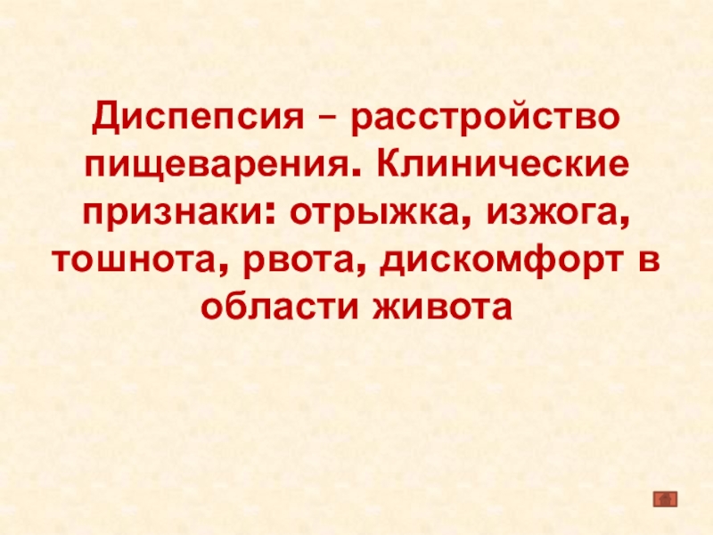 Слайд 50Диспепсия – расстройство пищеварения. Клинические признаки: отрыжка, изжога, тошнота, рвота, дискомфорт
