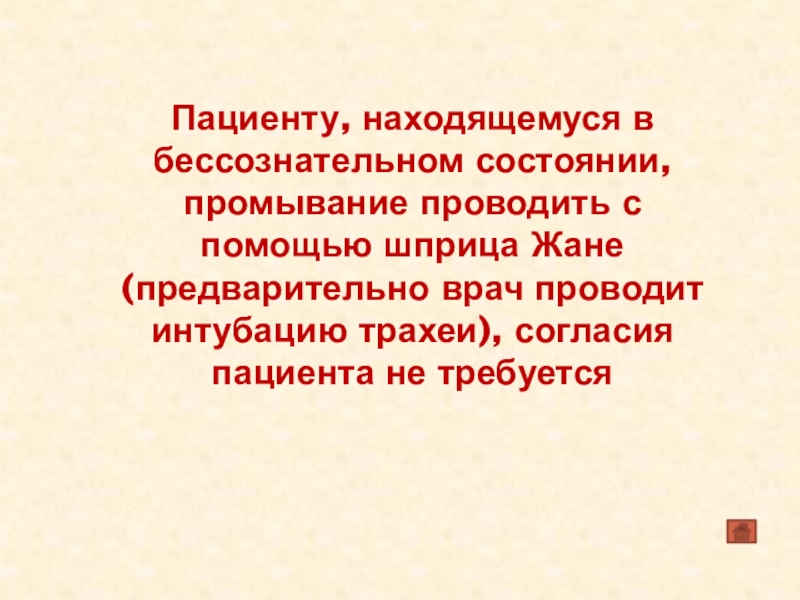 Слайд 60Пациенту, находящемуся в бессознательном состоянии, промывание проводить с помощью шприца Жане