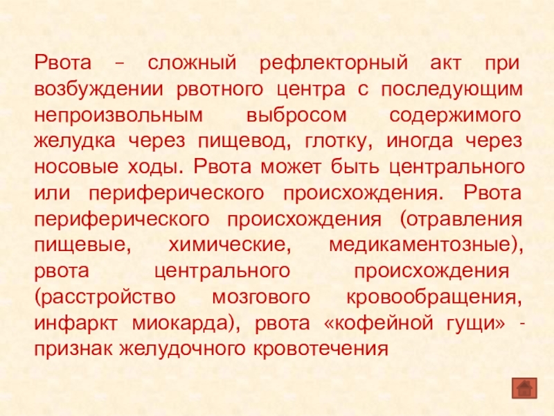 непроизвольным выбросом содержимого желудка через пищевод, глотку, иногда через носовые ходы. Рвота может быть центрального или периферического происхождения. Рвота периферического происхождения (отравления пищевые, химические, медикаментозные), рвота центрального происхождения (расстройство мозгового кровообращения, инфаркт миокарда), рвота «кофейной гущи» - признак желудочного кровотечения