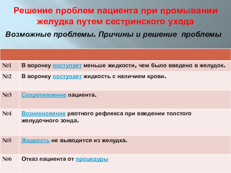Слайд 18Решение проблем пациента при промывании желудка путем сестринского ухода