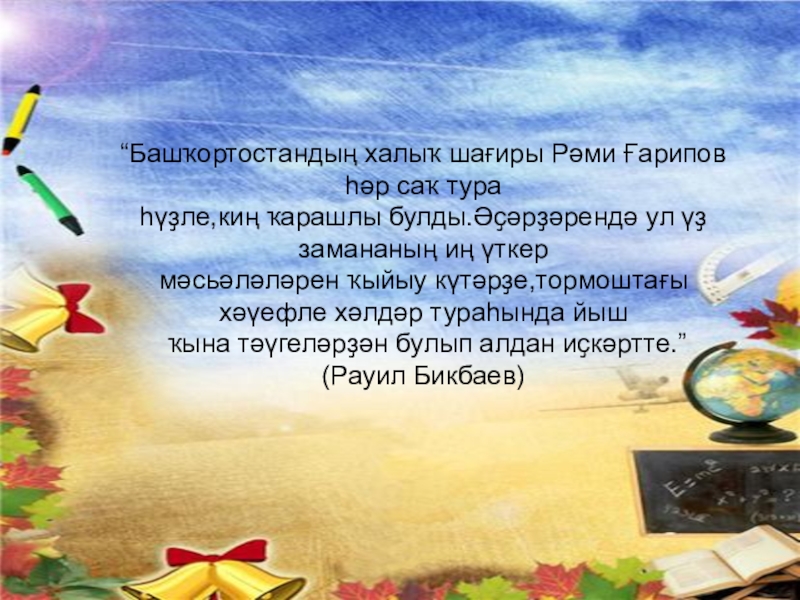 Слайд 6“Башҡортостандың халыҡ шағиры Рәми Ғарипов һәр саҡ тура