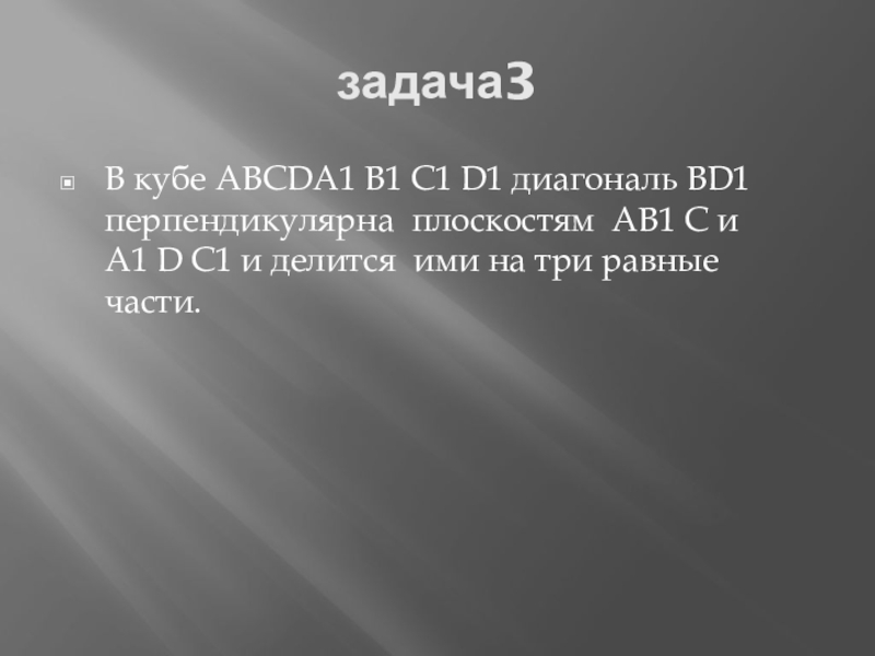 задача3В кубе ABCDA1 B1 C1 D1 диагональ BD1 перпендикулярна плоскостям AB1 C и