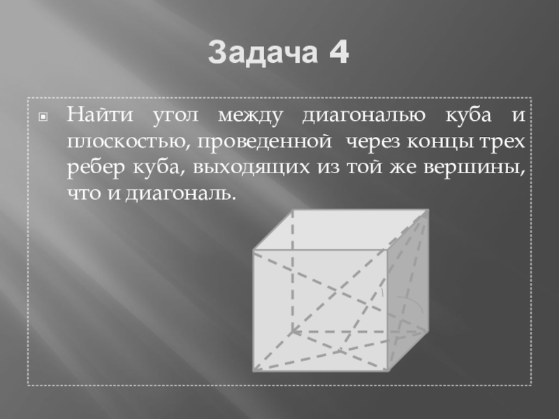 Задача 4Найти угол между диагональю куба и плоскостью, проведенной через концы трех ребер куба, выходящих из той