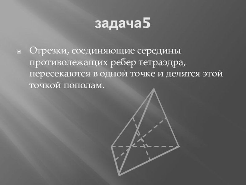 задача5Отрезки, соединяющие середины противолежащих ребер тетраэдра, пересекаются в одной точке и делятся этой точкой пополам.
