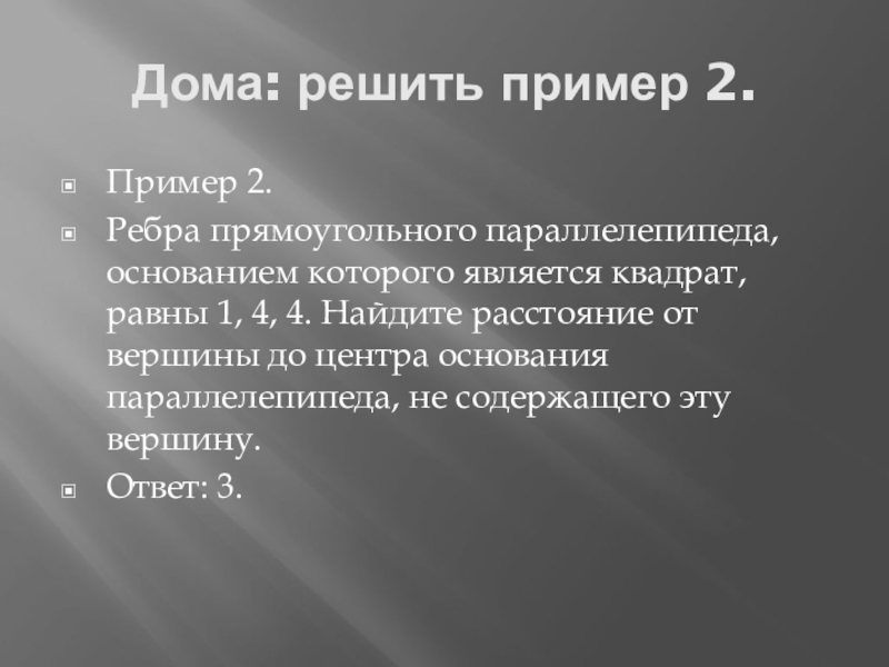 Дома: решить пример 2.Пример 2.Ребра прямоугольного параллелепипеда, основанием которого является квадрат, равны 1, 4, 4. Найдите расстояние